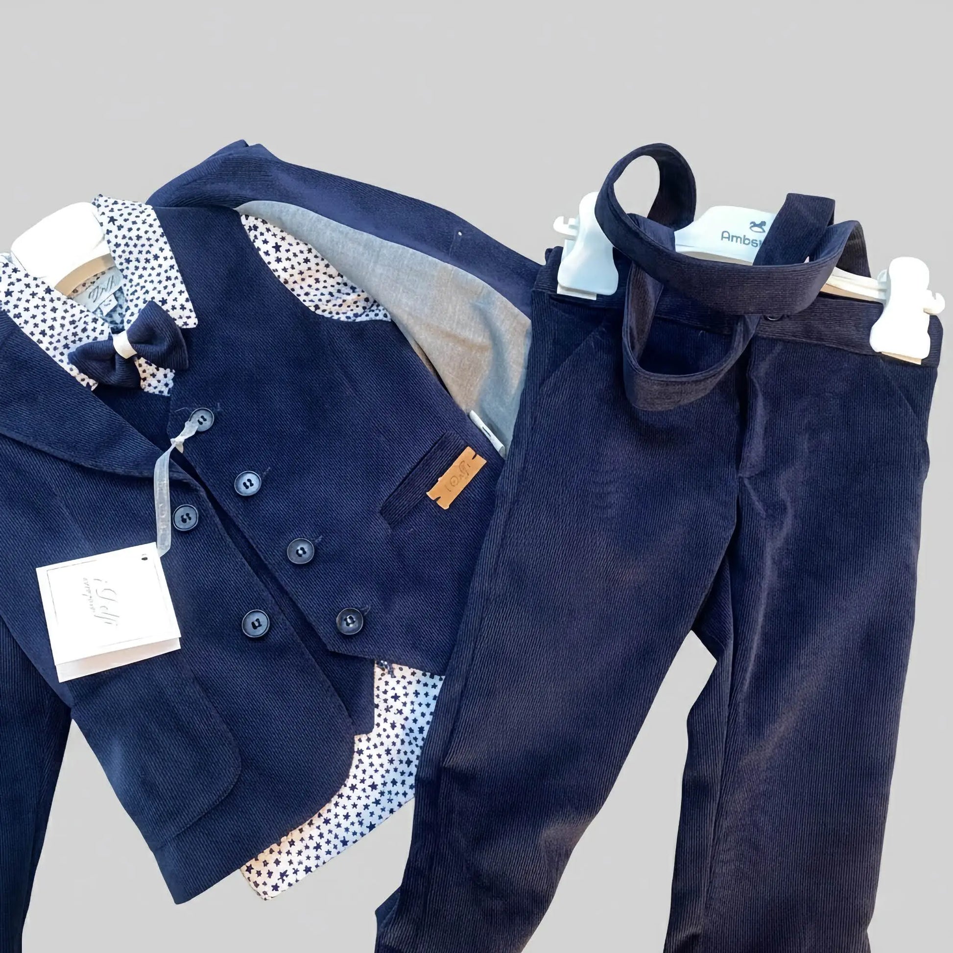 - Camicia personalizzabile: disponibile in versione bianca classica o con una vivace fantasia a stelline blu (dopo l'acquisto, contattaci per scegliere la tua camicia preferita).
